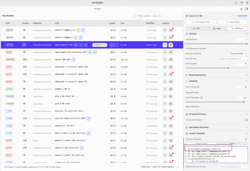 LM Studio 以图形操作为特色,需要修改模型的模板配置,在 LM Studio 的“我的模型”页面设置。