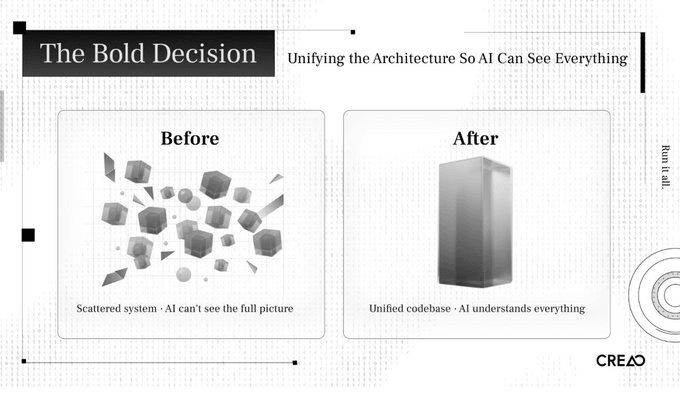 我们原有的架构分散在多个独立系统中。一次简单的变更,可能需要同时修改三到四个代码仓库。从人类工程师的角度看,这尚可管理;但从 AI 智能体的视角来看,却是一片混沌——它看不到全局,无法推理跨服务的影响,也无法在本地运行集成测试。