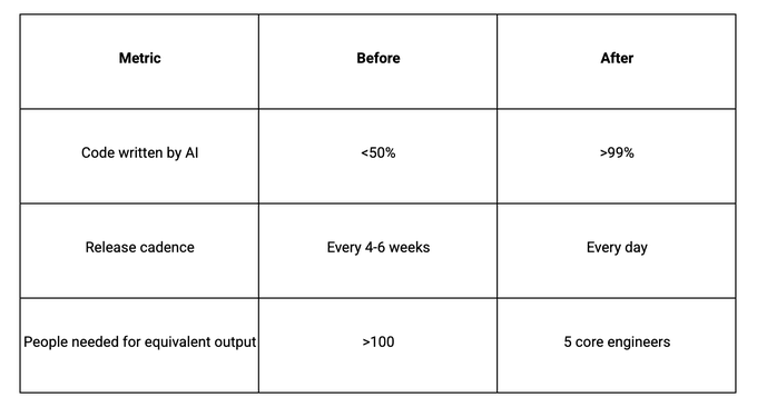 我们 99% 的生产代码都是由 AI 编写的。上周二上午 10 点,我们上线了一项新功能;中午就完成了 A/B 测试;下午 3 点,数据告诉我们不行,于是立刻下线;下午 5 点,我们就发布了改进版。要是放在三个月前,这样一个迭代周期得花上六周时间。